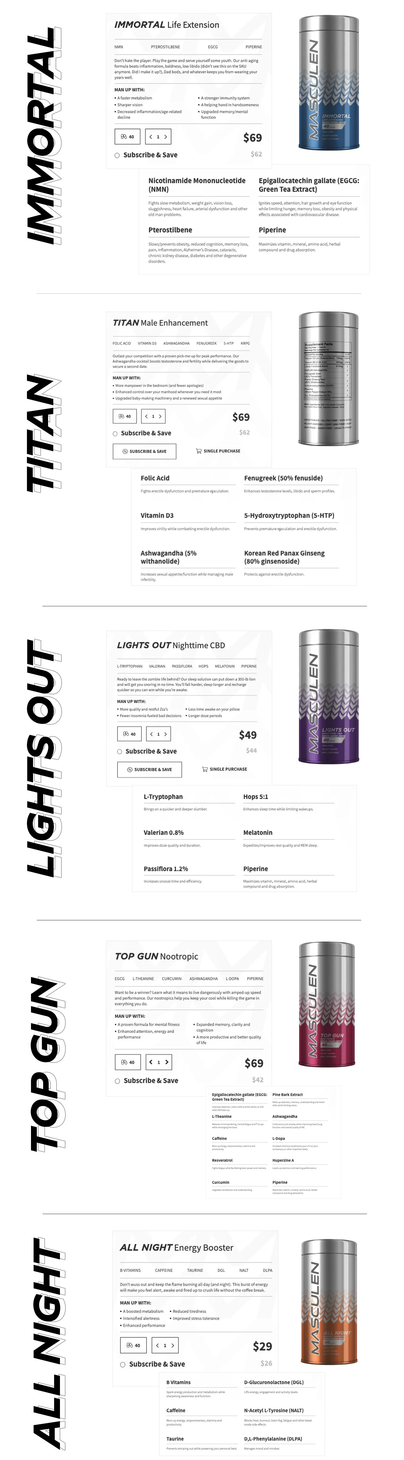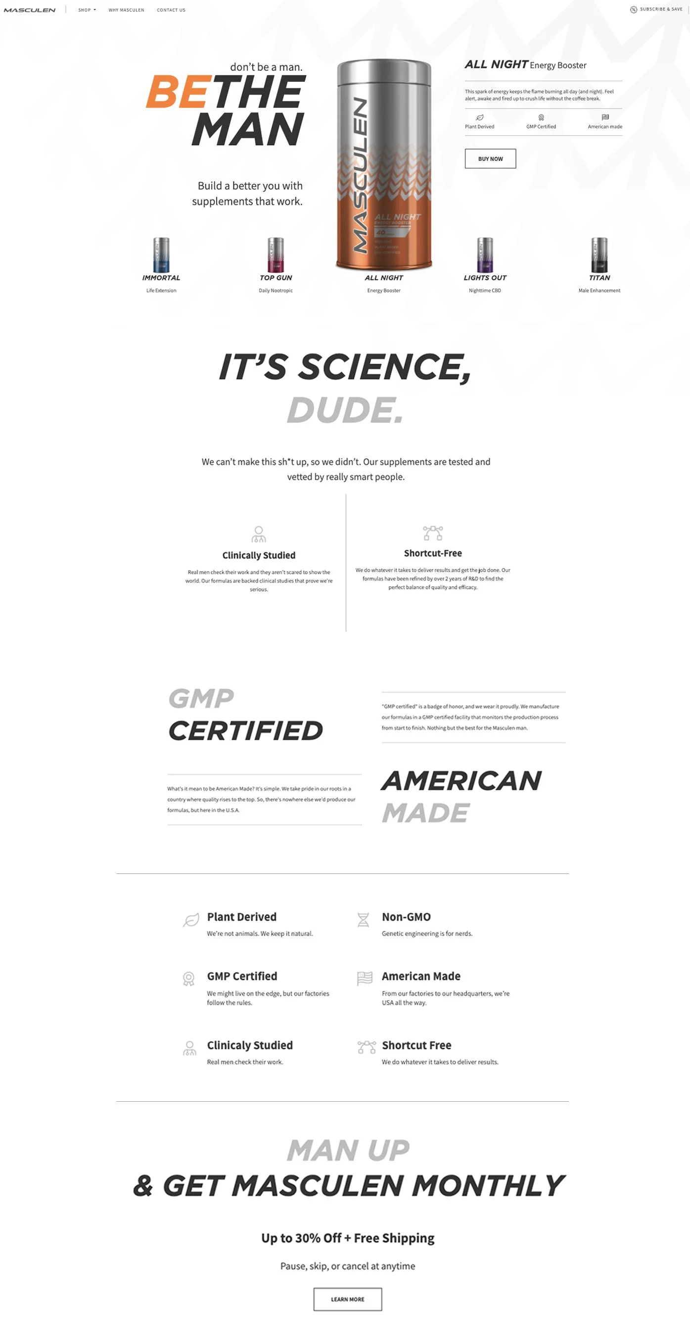 After finalizing their male supplements, the Masculen founders looked for a way to attract their audience online. Leading up to the brand’s launch, I created an ironically macho (but sensitive) brand voice to resonate with their unique clientele.